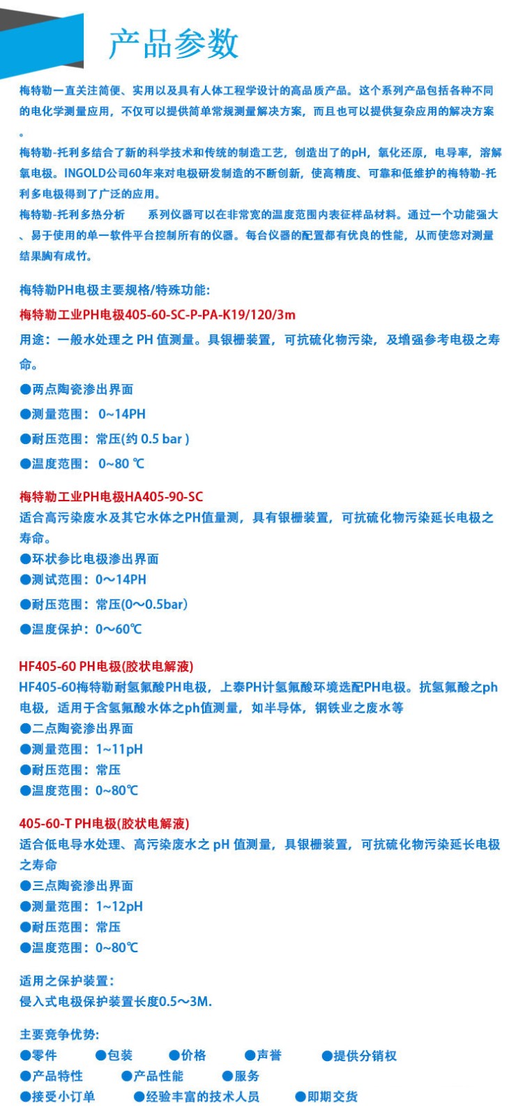 [耐氫氟酸PH電極]梅特勒PH傳感器HF405-60-P-PA-K19/120