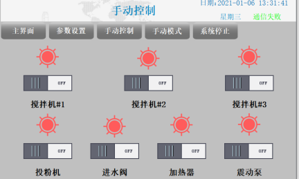 控制箱置于支架上,箱上各運轉(zhuǎn)設(shè)備及加熱件均設(shè)有“自動”與“手動”檔,當打至“手動”時,相應部分可由人工控制;打至“自動”時,則進入自動運行。若某設(shè)備出現(xiàn)故障時,則會報警,提醒用戶進行處理或檢修。