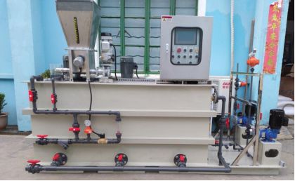 溶液箱的有效容積為500~5000L,它分成三個小室為配藥室、熟化室和儲液室,三個小室內(nèi)設(shè)有特制的攪拌機進行溶解攪拌,個室為預制部分,后兩段進一步進行攪拌,使藥劑與水充分混勻,制成均一濃度的溶液供使用。各室之間有溢流口進行連通,室滿后,流入第二室,依此類推,最后進入儲藥室內(nèi),儲藥室內(nèi)有高中低三個點液位傳感器,高液位為緊急停干粉投料器并停止進水,中液位為啟動干粉投料器與并進水,至低液位時,停計量泵。其中最高位與最低位時,在顯示屏上都會顯示液位狀態(tài),提醒操作人員是否供水故障(水壓不足、中間管道被堵、電磁閥漏水)或計量泵未工作。