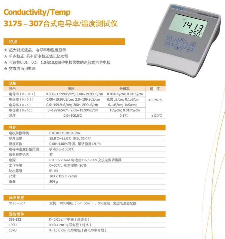 電導率K=1分辨率0.1 uS/cm ;1 uS/cm