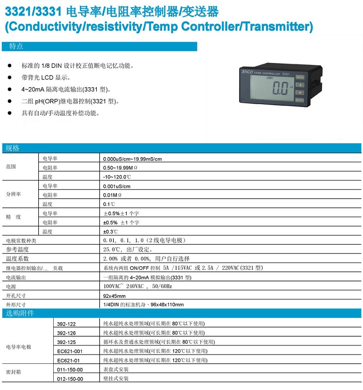 本產品為導電度、筆電阻、溫度合一控制器,1/8DIN,具2個可編程之開閉繼電器與背光功能。