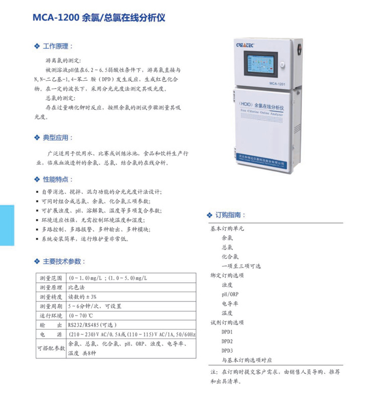DPD法小量程余氯在線分析儀MCA-1200技術參數