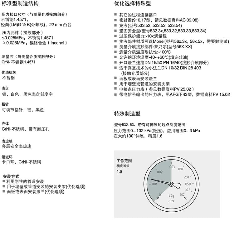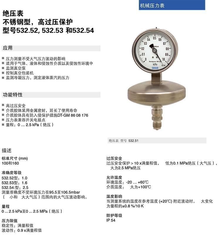 3. 絕壓表,帶有膜片,CrNi-不銹鋼制造結構壓力表:516.11 516.12 532.51 532 .52 532.53 532.54