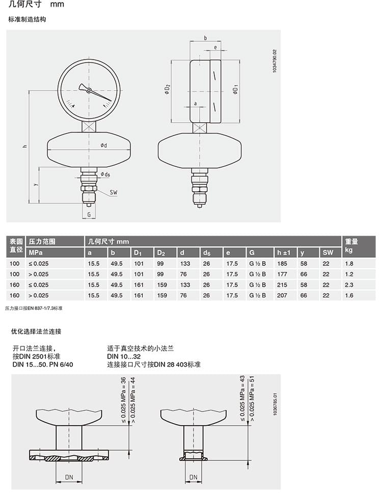2. 膜片壓力表,化學工業型,表頭不充液/充液,高過壓保護壓力表,針對UHP應用:422.12 432.50 432.56 423.36 423.25