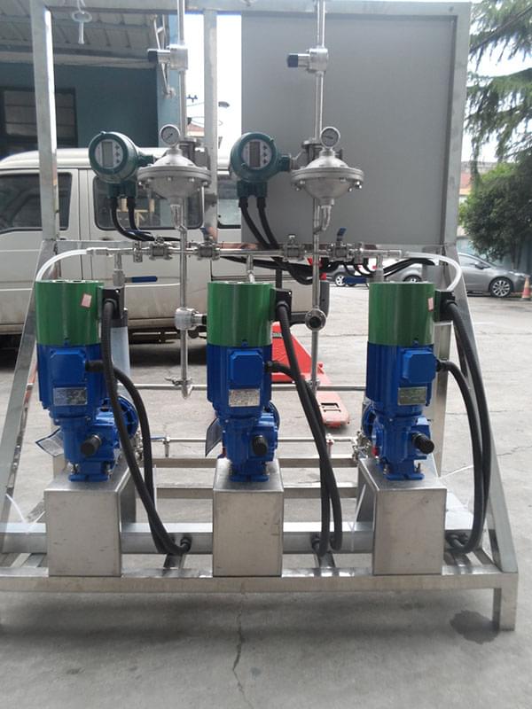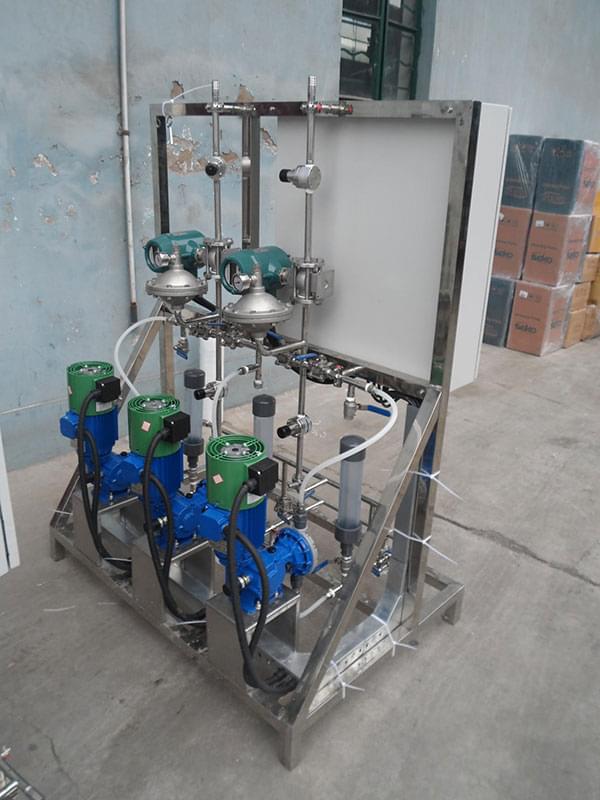 描述:該加藥裝置由主要用于造紙行業(yè)投加各種膠劑。為了保證系統(tǒng)24小時正常運行,該裝置使用一用一備的組合形式,為了管道使用壽命更長,所以管道均采用SS304材質及氬氟焊焊接技術。因造紙行業(yè)各階段的工藝不同,控制需要了解設備的運行狀態(tài)以及當前流量,從而更的投加藥劑。