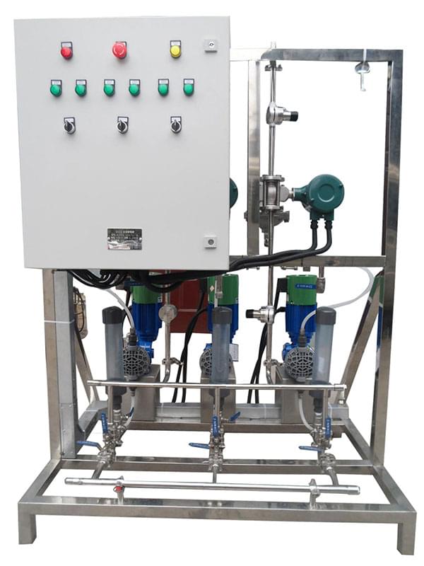 配置:該加藥裝置由計量泵、控制系統(tǒng)、流量計、變頻器、標定柱、背壓閥、安全閥和不銹鋼管道組成。