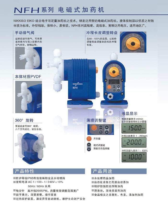 NIKKISO EIKO 結(jié)合電子與定量加藥機(jī)之技術(shù),研發(fā)泛用型的電磁式加藥機(jī),液體接觸部以之耐蝕材質(zhì)為標(biāo)準(zhǔn),外型,體積小,易安裝。NFH系列高精度、率、寬頻泛用電壓,適用地區(qū)廣。