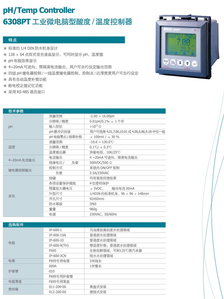 ?DIN面板設計,電極率顯示功能之單一參數分析儀,pH線性或類比傳送器輸出,磁滯控制,在pH校正期間不間斷操作。1個4-20ma輸出,5個繼電器,RS-485連結界面,本產品為點陣式顯示,電源使用為115/230V AC。