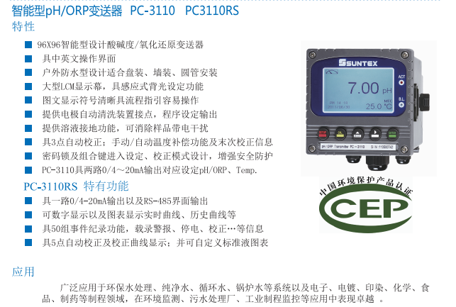 SUNTEX (中國環境保護認證)智能型pH/ORP變送器PC-3110 PC3110RS