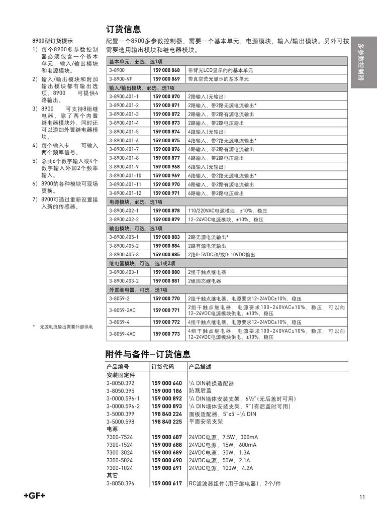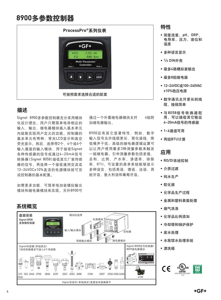 8900是GF儀表配合使用的多參數(流量,PH,ORP,電導率,溫度,壓力等)控制器.可配合使用+gf+signet絕大多數儀表.