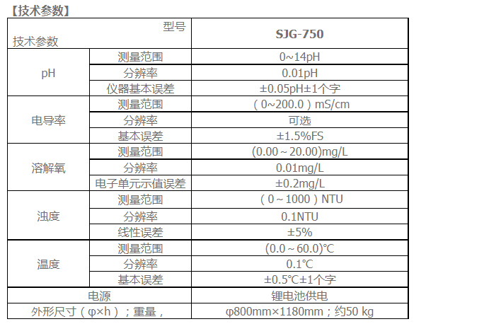 SJG-750型地表水多參數監測儀,浮標式結構,測量數據無線傳輸,適用于在河道水面上安裝作業。可同時監測pH、電導率、溶解氧、濁度、溫度等參數,為地表水水質管理提供可靠數據。