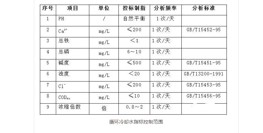 (2)需根據水質化驗結果(濃縮倍數、濁度、總磷)與循環水控制指標及加藥表進行對照,按要求進行排污、置換或加藥操作。